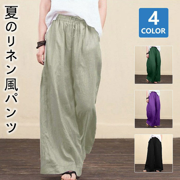 ワイドパンツ レディース バギーパンツ パンツ ワイド ガウチョ レディース 大人 リネン風 ボトムス ロングパンツ ルームウェア ウエストゴム レディース ゆったり 春 夏