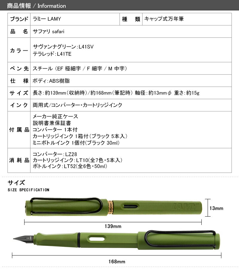 【ブランド】 ラミー LAMY 【種 類】 キャップ式万年筆 【品 名】 サファリ safari 【カ ラ ー】 サヴァンナグリーン:L41SV テラレッド:L41TE 【ペ ン 先】 スチール(EF 極細字 / F 細字 / M 中字) 【仕 様】 ボディ:ABS樹脂 【サ イ ズ】 長さ:約139mm(収納時)/約168mm(筆記時) 軸径:約13mmφ 重さ:約15g 【イ ン ク】 両用式/コンバーター・カートリッジインク 【付 属 品】 メーカー純正ケース 説明書兼保証書 コンバーター 1本付 カートリッジインク 1箱付(ブラック 5本入) ミニボトルインク 1個付(ブラック 30ml) 【消 耗 品】 コンバーター:LZ28 カートリッジインク:LT10(全7色・5本入) ボトルインク:LT52(全6色・50ml) 【商品説明】 世界中の筆記具ファンから絶大な支持を集める「ラミー サファリ」は、1980年に登場しました。
