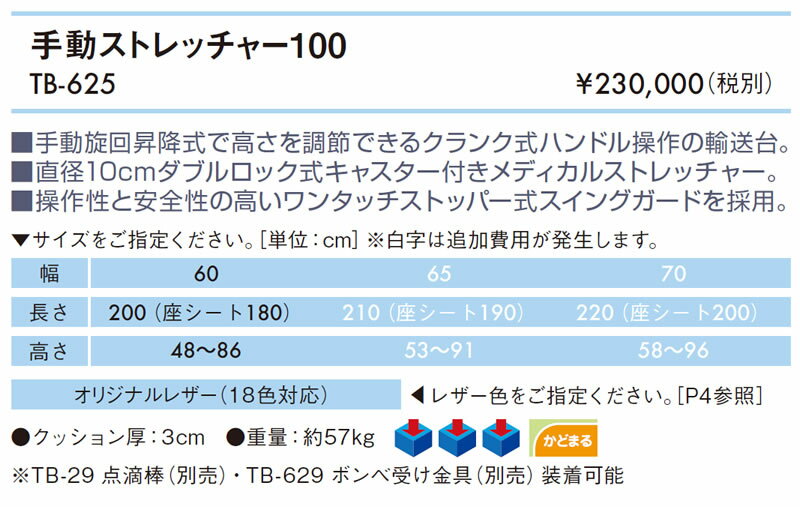 ※TB-29 点滴棒(別売)・TB-629 ボンベ受け金具(別売)装着可能 レザーカラーは18色のオリジナルレザーからお選びいただけます。