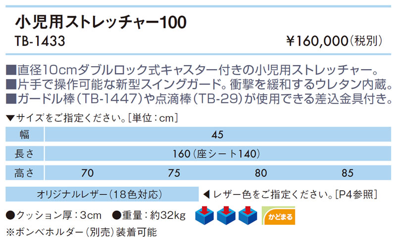 TB-1433 小児用ストレッチャー100 直径10cmダブルロック式キャスター付きの小児用ストレッチャー。